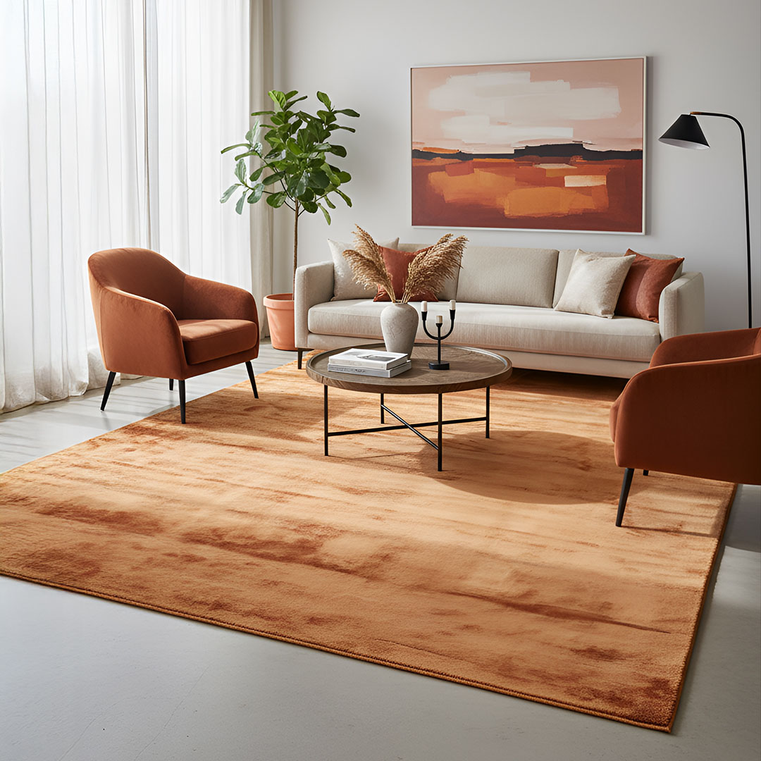 Vloerkleed FLAVIA in de kleur Koper trekt de aandacht met zijn warme, glanzende tint. Deze kleur geeft je ruimte een unieke twist en laat zich goed combineren met hout en andere aardse kleuren.