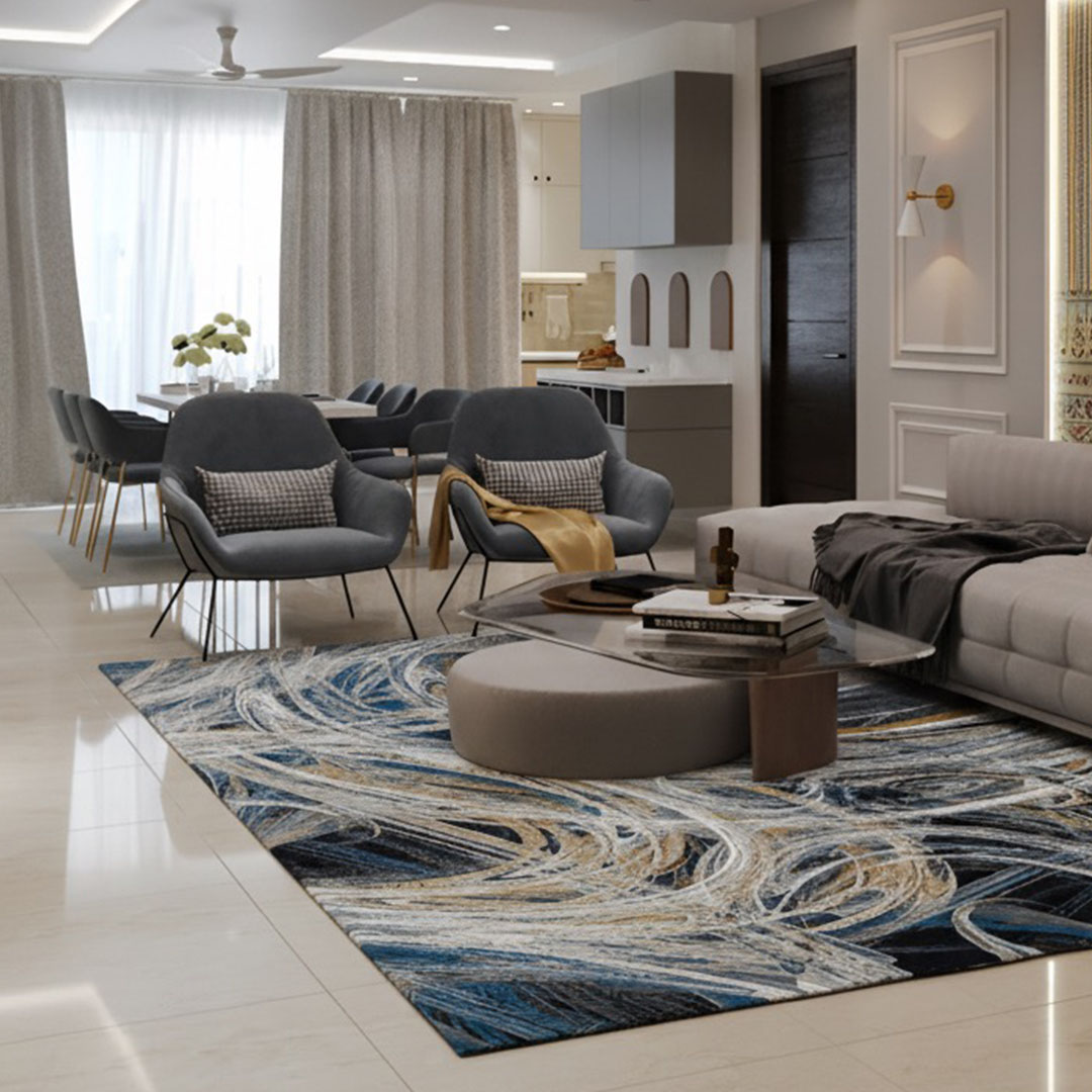 De OLYMPIA ST-706 speelt met vrije vormen in golvende, circulerende banen. De lijnen lijken haast met de hand getekend en brengen subtiele beweging in het ontwerp. De kleuren Beige, Blauw, Grijs en Ivoor vloeien harmonieus samen, waardoor het kleed zowel speels als stijlvol aanvoelt.